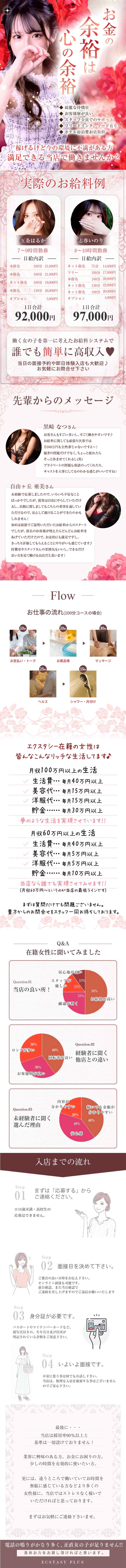 ★☆エステ最高クラスのお給料をお約束☆★ ■日本橋・谷町9丁目・梅田エリアの同ジャンル他店様とは圧倒的に稼げる金額が違います(^^)/ 10代・20代・30代が稼げる人気の日本橋エリア! 💕入店特典💕 ✨交通費全額大支給✨ 領収証お忘れなく😊 【3~4時間位】 約20,000円~ 【6~8時間位】 約35,000円~ 貴女の頑張り次第では75分20,000円も夢じゃない✨ ☑日給50,000円以上可能! ☑全額完全日払い制! ☑各オプションのバックも高バック! ☑罰金・罰則・ノルマなんかもありません(^^)/ ■掛け持ち・移籍をお考えのキャストさんも大歓迎 ☑お昼のお仕事や同業他店の掛け持ちもOKです。 今、在籍中のお店と比べてください♪ ☑移籍を考えてる女性やエステ経験者様も大歓迎ですよ。 ■シフトは申告制 ☑本業や家庭を優先にしてお仕事ができます。 ☑週1日や月1日のみの出勤も可能です! ☑短期や長期の勤務は問いません(^^)/ ■身バレの心配なし ☑顧客管理システムでお客様を一人一人把握しております。 ☑お店の待機場&自宅待機でもお仕事していただけます! ☑お仕事で必要なものはすべてお店で準備しています。 ■こんな女の子にオススメ ☑未経験からでも働きやすい簡単な内容です! ☑性感エステ店・メンズエステ店でお給料が安くて悩んでる女性の皆さん ☑長時間の受け身で肉体的にも精神的にも苦手な女性の皆さん ☑喜んでもらえるのが嬉しかったり好きだという奉仕精神の強い女性の皆さん ☑ゆっくり時間をかけた癒し系の接客が好きな女性の皆さん ☑ご自身でぽっちゃり、ぽちゃ体型だとお考えでも面接歓迎 ☑タトゥーやリストカットの女性も大歓迎! 入店して頂ければ全員稼げるエステ店です。 随時キャスト大募集中! 当店『新ハイブリッドエステ・エクスタシーPlus』では面接にお越しいただくお時間を大切にさせていただいております(^^)/ |