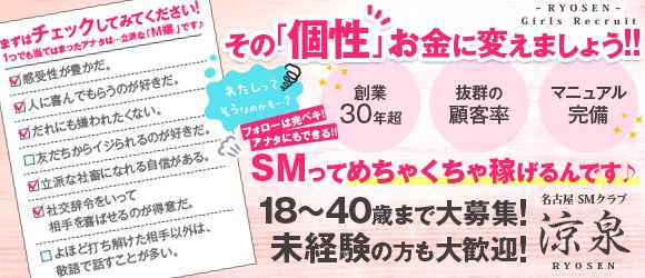 多数の常連様に愛されて30年 名古屋SM、特にM嬢シェアにかけては トップと自負しております 当クラブでのお客様の支払う料金はハッキリ言って高いです! お金はもちろん、時間にも余裕のあるお客様ばかりです。 ガツガツされているお客様も一切おりません。 出来ない事はNGプレイで構いません。 SMで楽しみながら稼ぎませんか? 1本のお仕事でもびっくりするくらい稼げますよ!! オフィシャルサイト http://www.ryousen.com/ オフィシャル求人 https://www.rec-ryousen.com/ 店名:SMクラブ 涼泉 業種:出張SM 勤務地:中区、丸の内 Tel:052-218-6186 |