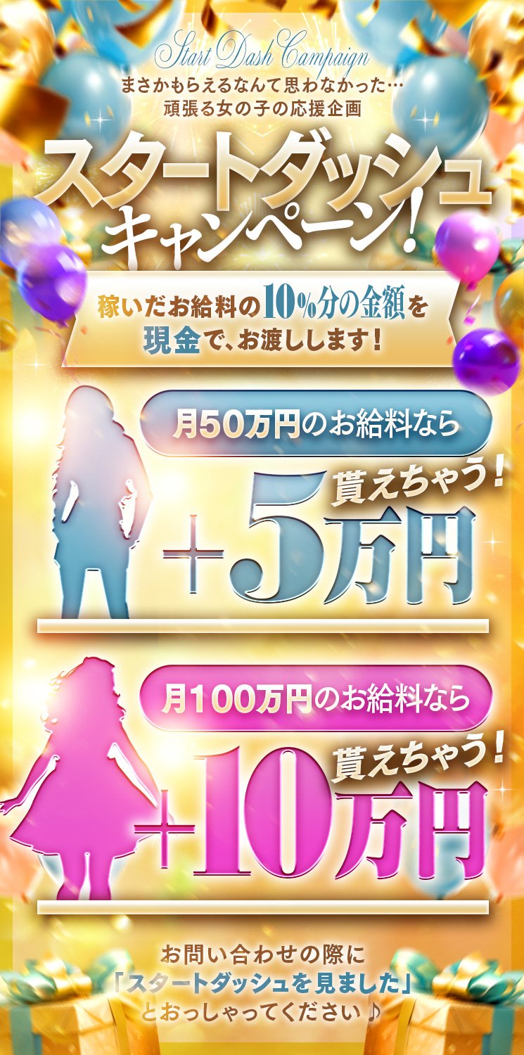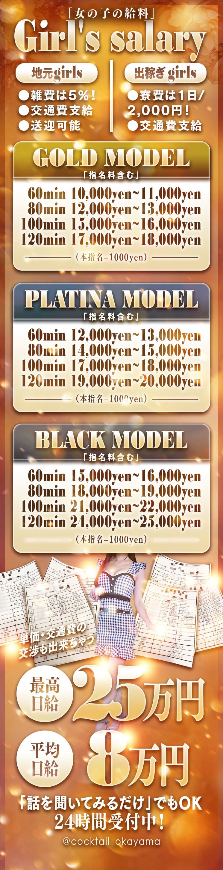 BLACK MODEL (指名料込み) 60分 ¥15,000~¥16,000 80分 ¥18,000~¥19,000 100分 ¥21,000~¥22,000 120分 ¥24,000~¥25,000 PLATIUM MODEL (指名料込み) 60分 ¥12,000~¥13,000 80分 ¥14,000~¥15,000 100分 ¥17,000~¥18,000 120分 ¥19,000~¥20,000 GOLD MODEL (指名料込み) 60分 ¥10,000~¥11,000 80分 ¥12,000~¥13,000 100分 ¥15,000~¥16,000 120分 ¥17,000~¥18,000 ※本指名様の場合別途 +1000 ※ボーナス支給制度あり 給与シミュレーションはこちら |