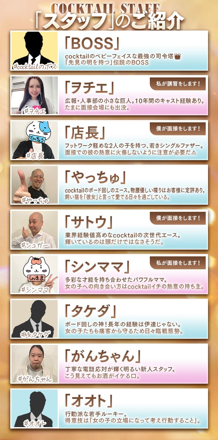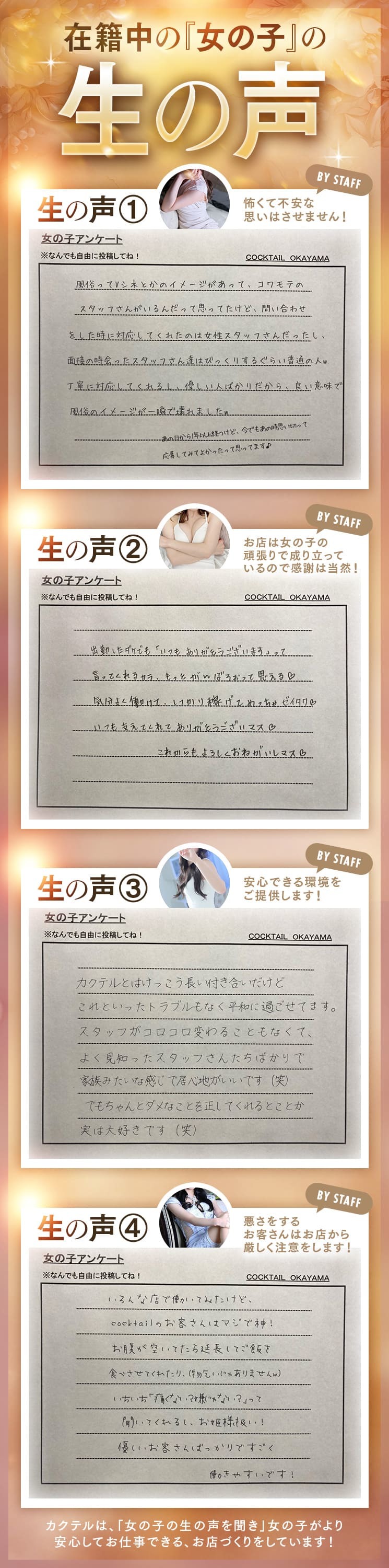 | POINT | *〜*〜*〜*〜*〜*〜*〜*〜*〜*〜*〜* Esperanzaグループ・cocktail岡山店は 「今」を生きる全ての女性を支え応援します!! *〜*〜*〜*〜*〜*〜*〜*〜*〜*〜*〜* 「Esperanza」スペイン語で「希望」。 創業以来変わらない、みなさまの「夢と希望」を一緒に叶えたい。叶えるお手伝いをさせて欲しいという想い。 そんなEsperanza(希望)グループのスタートであるcocktail岡山店。 みなさまの今抱えている「不安」や「不満」を一緒に背負わせてほしい!解消させてほしい! そして、一緒に「夢」を叶える「希望」を持ちたい! 「夢」を叶えるお手伝いをさせてほしい! 「夢」を見つけるお手伝いをさせてほしい! 「お節介」と言われるかもしれません。 「自己満足」だと思われるかもしれません。 ですが、業界で働く女の子には心の底から「笑顔」でいてほしい。 これは私たちの「夢」であり、「希望」でもあります。 それをどんなお店よりも強く想い、現実にさせるお店がcocktail岡山店。 そして、一度でもご縁が持てれば、その瞬間からあなたと私たちはもう「仲間」です。 そんな「仲間」の「笑顔」を守りたい!と誰よりも強く想うスタッフたちがいるのもcocktail岡山店。 そんなお店で約10年、キャストとしてこのお店を見て、体感してきた私が保証します✨ 〜人事部:ヲチエ〜 精神的にも身体的にも男性には計り知れないリスクを 業界の女の子たちは背負っていると思います。 そんな状況下で僕たちができることが必ずあるはずだと! それはピンチをチャンスに変えること! 女の子たちを支えていくため 僕たちも今まで以上に進化をし続けなければなりません。 そのためにもあなたの「声」が必要なんです! あなたの「今」を教えてください! お願いです… どうかひとりで思い悩まないでください… 今の不安や不満を話すだけでもいいんです。 匿名でもいいんです。 あなたの「今の想い」を聞かせてください。 そして、みなさまの「夢」「希望」「想い」を守り、叶えるお手伝いをさせてください。 〜cocktail岡山店・男性スタッフ一同〜 |
