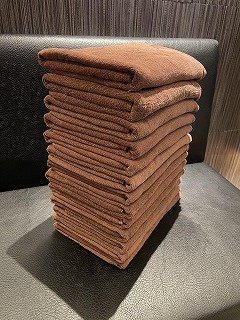 接客に使用するタオルですが、業者さまにてクリーニング頂いたものを、一枚一枚畳みなおしてから使用しています。