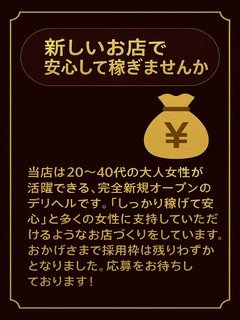 【給与について】 ・日給3万〜8万円以上可能 ・指名料・オプション100%バック ・完全日払い制/罰金・ノルマ・雑費一切なし