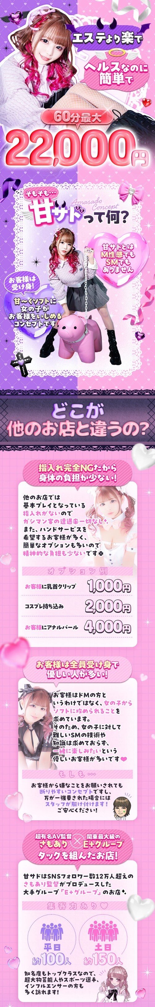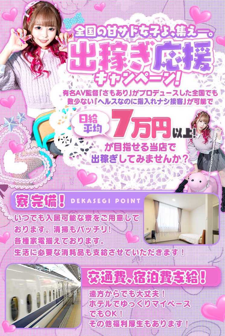 指入れ無しのソフトサービスでも60分最大20,000円まで可能!!平均日給6万以上!!日給10万オーバーも続出中!!月給200万オーバー続出中!!全員体験入店から60分11,000円以上!!さらに雑費無料!!甘サドで指入れ無しのソフトサービスで『過去最高額』を稼いじゃおう!!