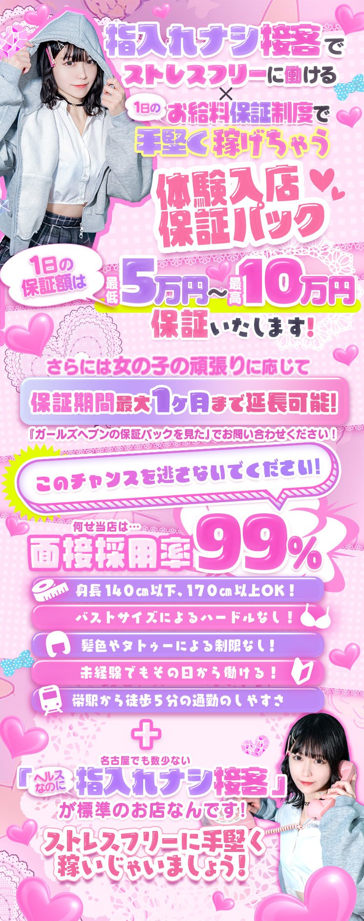 | A | 面接採用率99%!容姿や年齢、業界経験の有無にかかわらず様々な方にご応募いただいております! |