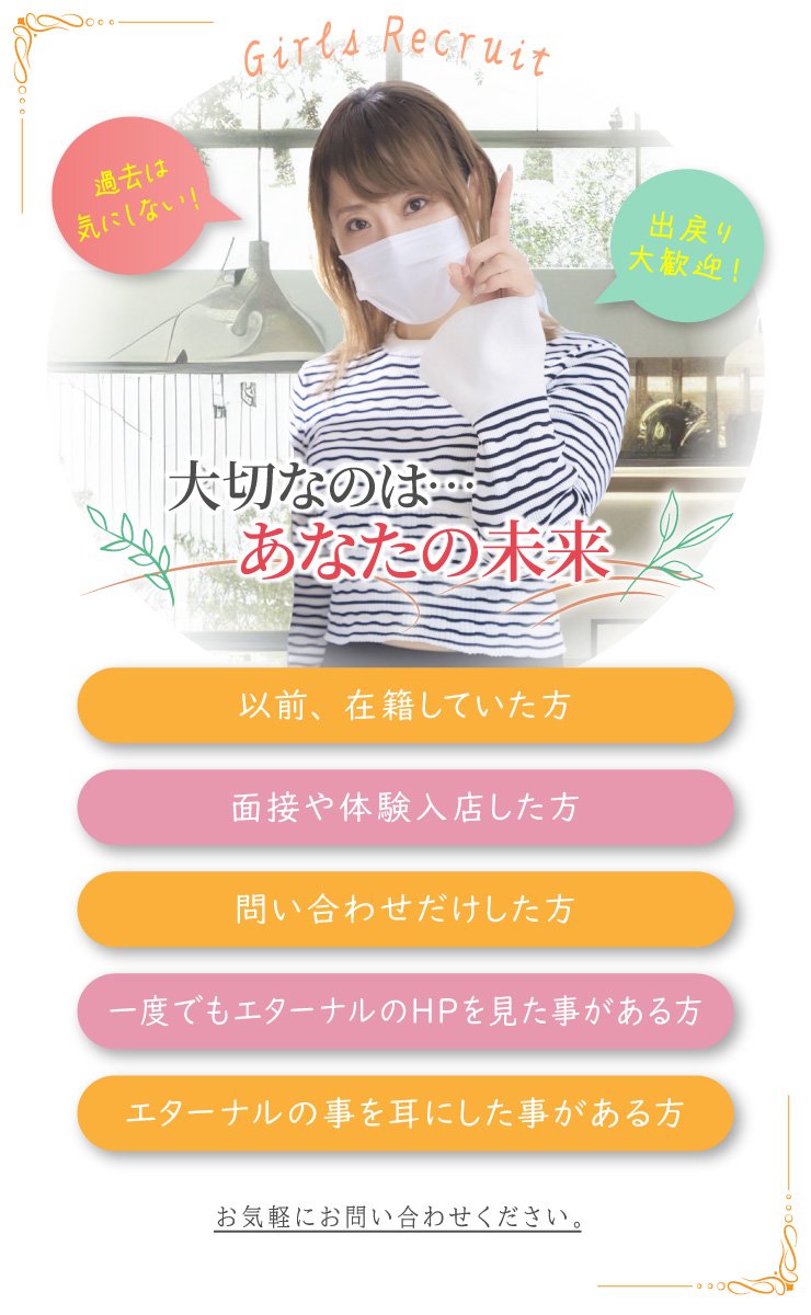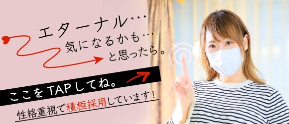 | A | エターナルでは、女性の知人バレを防ぐために、お仕事前の女性が、店内のお客様をモニターで確認できるようになっております。女性が安心して働いて頂ける様な環境づくりを徹底しております。 NETのお写真を全モザイクにする事も可能ですし、店内のパネルも顔隠しにすることが出来ます。 当店は知人バレ対策をされている女性も多く、お顔を出さないからといって、収入的に不利になる事もございませんのでご安心下さい。 中には「NET掲載無し」「写メ日記無し」といった対応をさせてさせて頂いている女性もいらっしゃいますので、面接の際ご相談下さい。 |