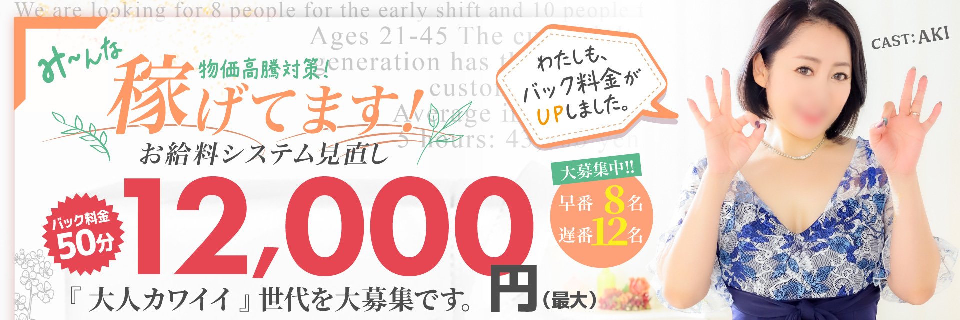 | A | 片番勤務(約7~8時間)平均で5万円と考えて頂ければと思います。 当店は優しい女性でしたら誰でもしっかり稼いで頂くことが出来ます。 入店翌月から月収100万円以上稼ぐ方も沢山いらっしゃいます。 Wワークで時間の無い方や、子育てをしながらという方で、2~3時間といった短い時間しか働けないという女性でも大歓迎♪ 2~3時間の勤務でしたら平均1万8千円と考えて頂ければと思います。 当店で働かれている女性で、在籍年数が5年10年と長く勤めている方も沢山いらっしゃいますが、継続して安定した収入を稼いで頂いていますよ。 |