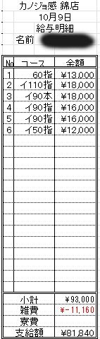 10/9(木)直近の女の子の【給料明細】大公開!!