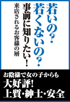 ご来店されるお客様は、比較的年齢層が高く紳士的で経済的に余裕のある方が多く、落ち着いた雰囲気を好まれます。