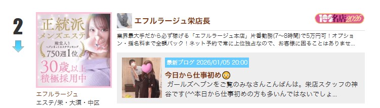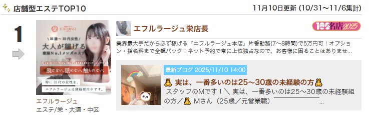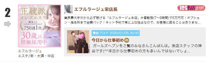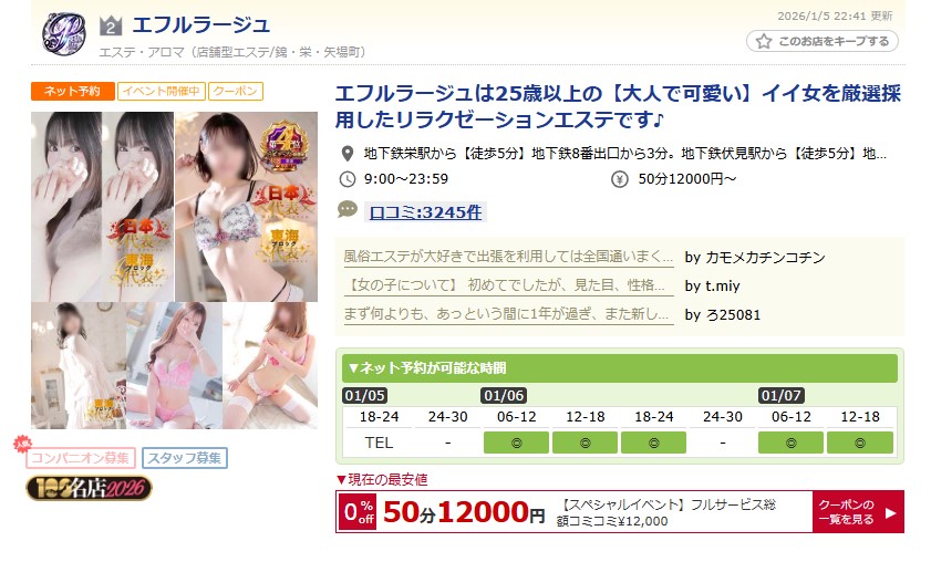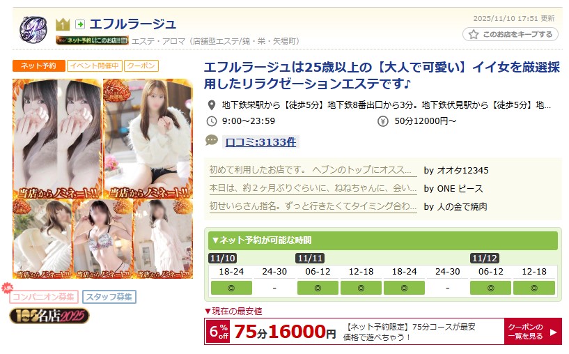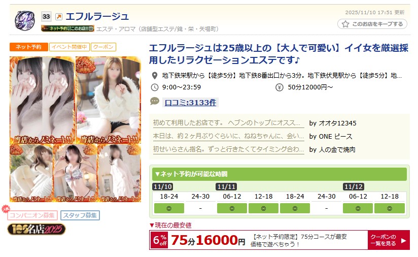 業界最大手だから必ず稼げる「エフルラージュ本店」片番勤務(7~8時間)で5万円可!