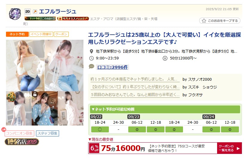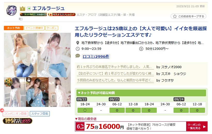 業界最大手だから必ず稼げる「エフルラージュ本店」片番勤務(7~8時間)で5万円可!
