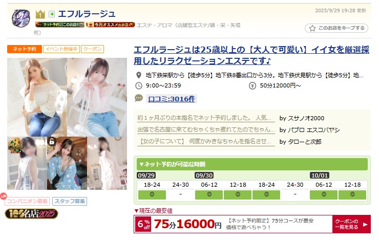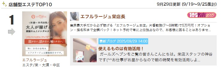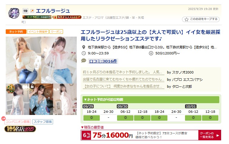 業界最大手だから必ず稼げる「エフルラージュ本店」片番勤務(7~8時間)で5万円可!