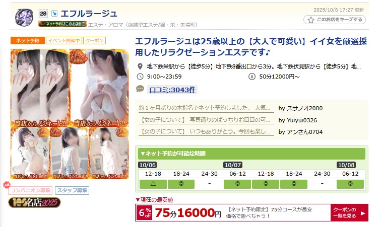 業界最大手だから必ず稼げる「エフルラージュ本店」片番勤務(7~8時間)で5万円可!