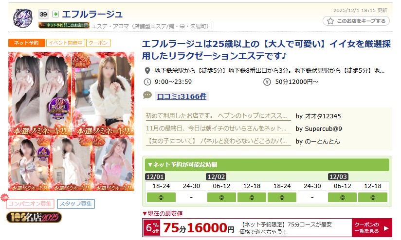 業界最大手だから必ず稼げる「エフルラージュ本店」片番勤務(7~8時間)で5万円可!