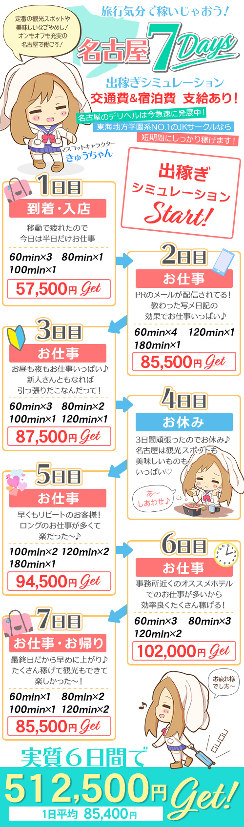 ニックネーム:☆50分10,000円~16,000円 プラス本指名料・オプション料フルバック!!☆ JKサークル名古屋店☆コスプレできるコンセプト店で、楽しく遊んで楽しく稼ぐ !当店では普通に遊んで生活を充実してくれる方を募集中!!