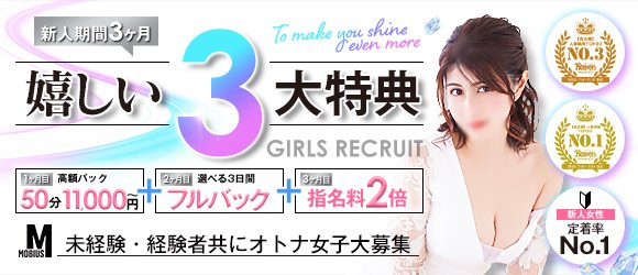 ありがたいことに当店は、新人女性の在籍定着率が非常に高く、”口コミ”でも最高評価を頂いております⭐稼げるのは当たり前で、女性にとって”働きやすさ”や”待遇”を1番に考えております。メビウスなら確実の安定.高収入をお約束致します⭐
