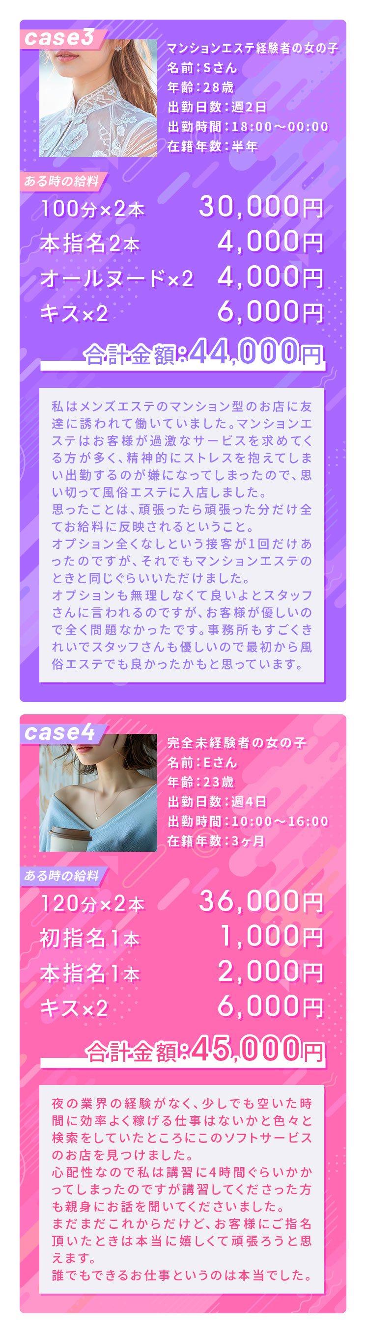 | A | 未経験の方でも安心して働いていただけます。 当店では、いきなりお仕事をして頂くことはなく、まずは女性講師によるマンツーマンの研修からスタートします。 マッサージの基本技術や接客マナー、会話のコツ、トラブル時の対応など、仕事に必要なことを丁寧にお教えします。 講習はあなたのペースに合わせて進める為、焦ることなくしっかりと身につけられます。 多くの女の子が未経験からスタートし、自信を持って活躍中です。 不安なことやわからないことはいつでも相談できる環境が整っており、スタッフ一丸となってあなたの成長をサポートします。 |