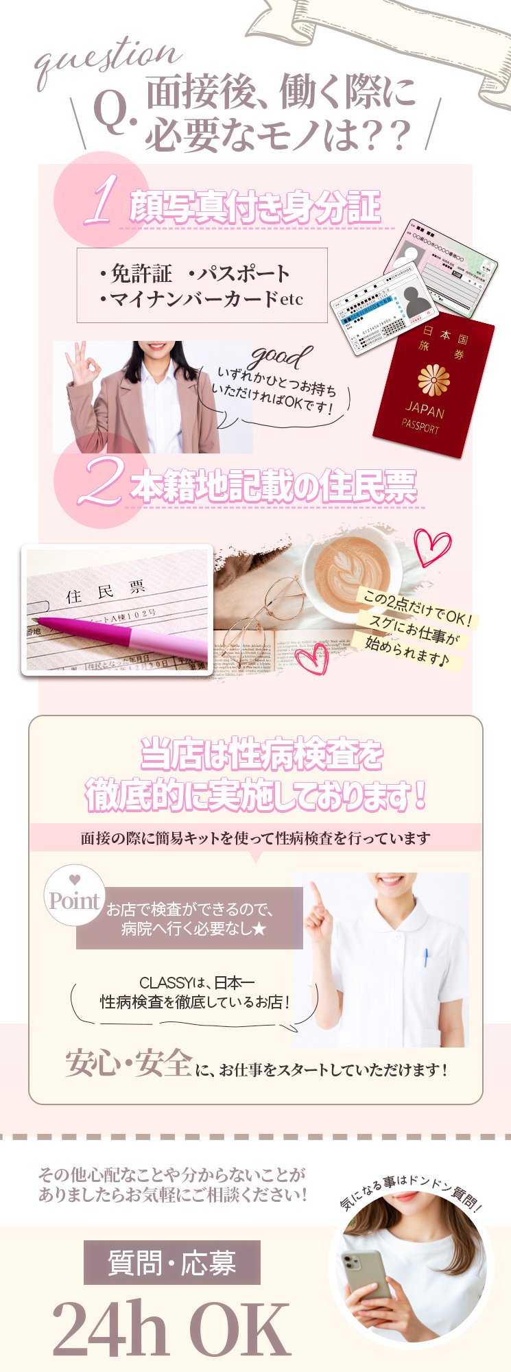 | A | お好きな面接方法を選べます。 ・事務所やお店で面接 お近くにお住まいの方や素早く仕事がしたい方は 是非こちらをオススメします。 簡単なプロフィール・アピールポイントなど記載して頂き 本籍地入り住民票と顔写真付きの身分証が手元にありましたら すぐに働いて頂けます。 ・出張面接 ファミレスや喫茶店で面接致します。 事務所に行くのに抵抗のある方や 遠方の方は遠慮なくご利用くださいませ。 不安が安心に変わり”働いてみようかな”と思ったら その日からでも稼いで頂けます。 |