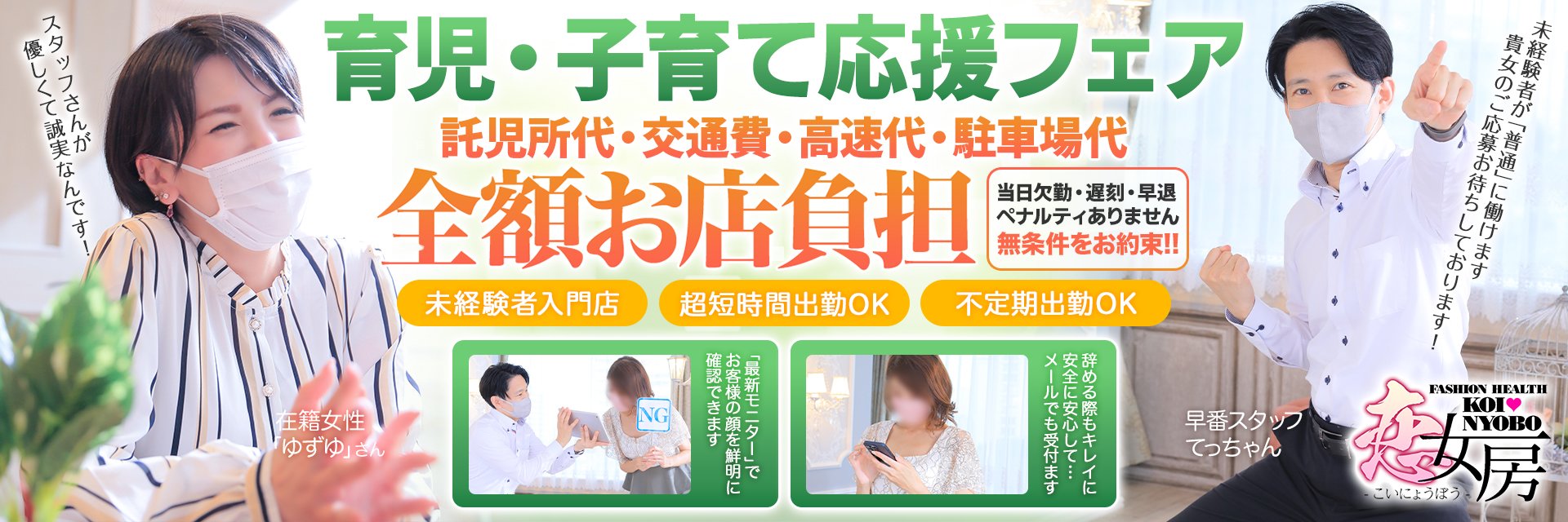 『託児所代・交通費全額お店負担』『未経験者専用質問部署』『お客さんの顔をモニターチェック』『店舗型』『ネット非掲載OK』『超短時間OK』
