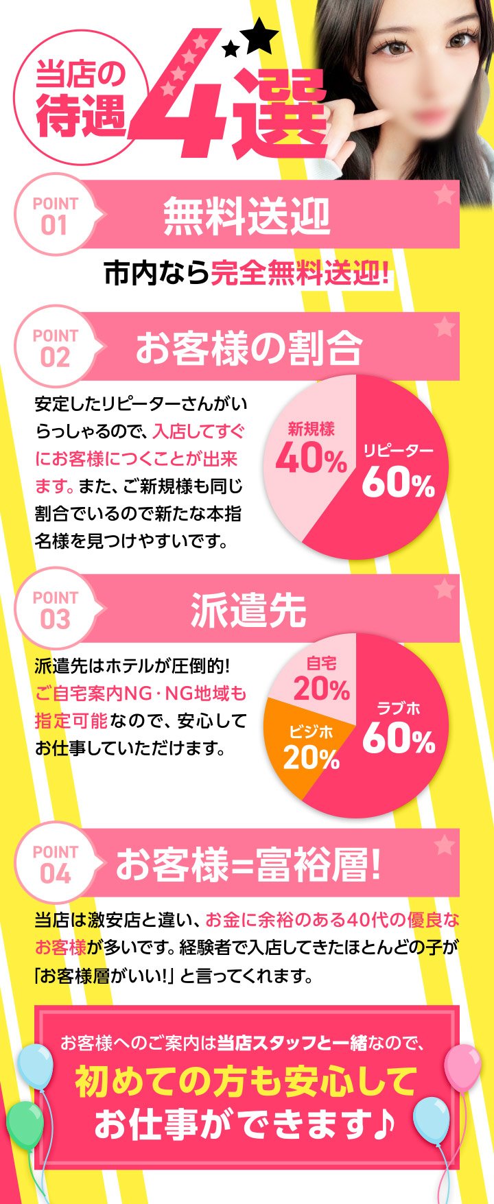 見学のみOK 体験入店OK 面接交通費支給 友達と面接可 オンライン面接○ 出張面接○ 写メ面接○ 採用率90% 自由出勤 週1~2日 土日のみOK 1日2時間 1日5時間 短期OK バック率80%以上 保証制度あり 完全日払い 交通費支給 指名料バック 送りあり 迎えあり 無料駐車場あり 駅から徒歩5分以内 掛け持ちOK 講習なし イケメン従業員 衛生対策あり 生理休暇 寮完備 個室待機 自宅待機 アリバイ対策対応可能 即日勤務OK 未経験者歓迎 経験者歓迎 大学生歓迎 巨乳 貧乳 ぽっちゃりの方
