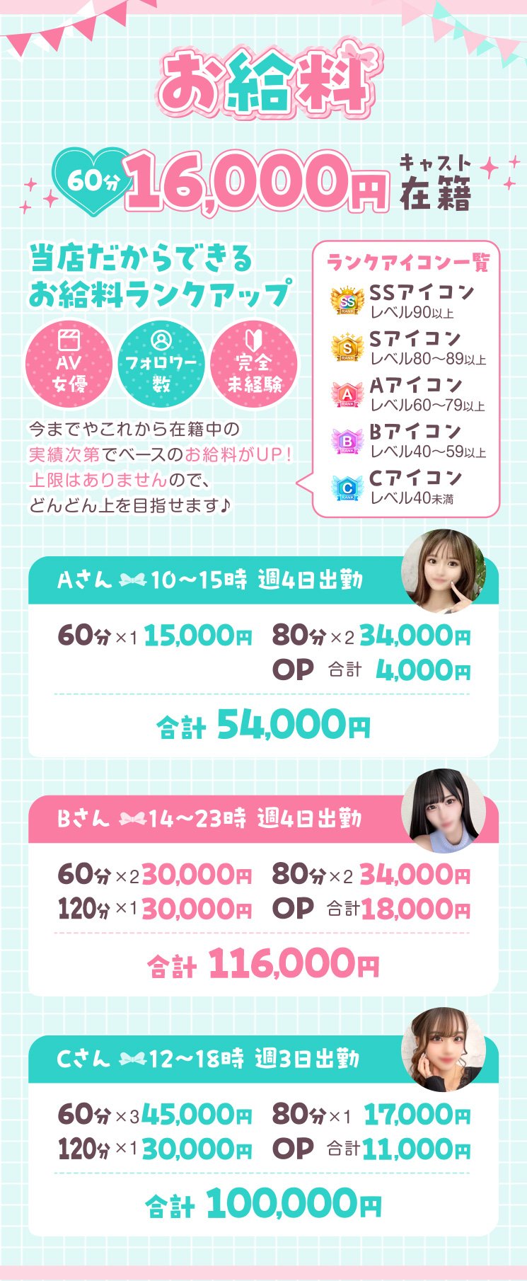 | A | 60分最大16,000円バックとなっています。 最低でも10000円バックです。 アナタの魅力に最大限還元いたします。 |
