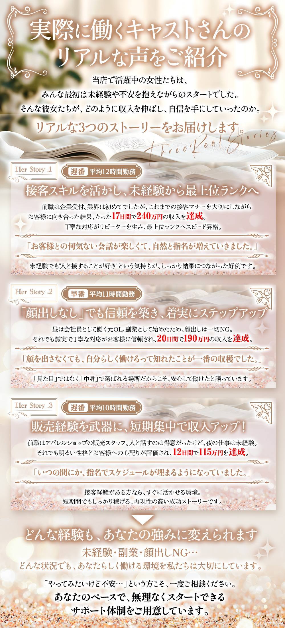 昼間は事務職として働いているんですが、生活費の足しになればと思って思い切って応募してみました。最初はすごく不安だったけど、面接でスタッフさんが丁寧に説明してくれて、すごく安心できたのを覚えています。実際に働いてみると、予想以上にお客様が紳士的でびっくりしました。現在はこのお仕事一本で、しっかり稼げて夢に向かって頑張ってますあと、まかないが美味しくて地味に楽しみです