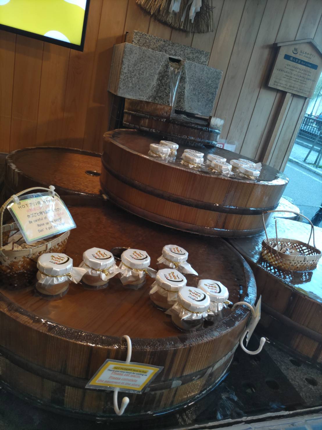 下呂の温泉街で足湯に入りながら温泉プリンを食べていました🎵