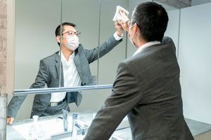 今日もマネージャーが、待機ルームの清掃具合をチェック!鏡がちょっと汚れていたようで、すかさずクリーンアップの図。