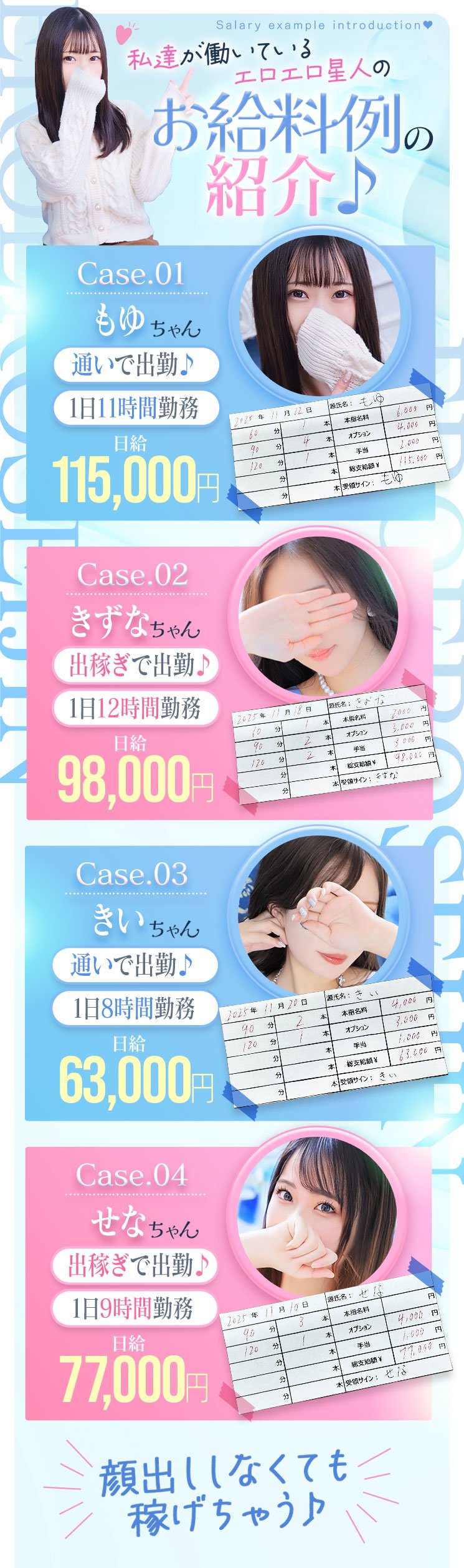 エロエロ星人グループは1826日連続1位の奇跡のお店です!東海屈指のブランド力と東海地区最大級の莫大な広告宣伝費による圧倒的【抜群の集客力】が自慢です!女の子の働きやすい環境を第一に考え、豊橋初の待遇をたくさん実現☆