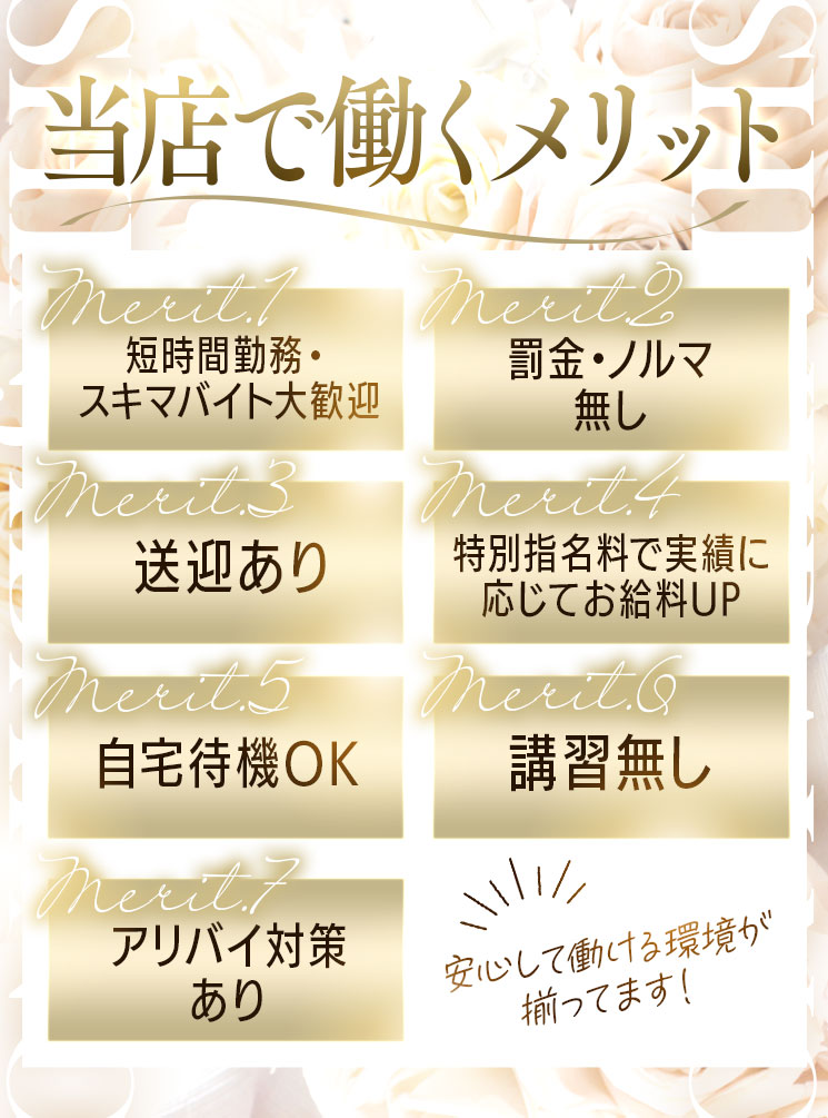 | 【高日給】確約 | あなたの能力と頑張りに、業界トップクラスの高待遇でお応えします。努力がそのまま報酬に直結する環境です。 |