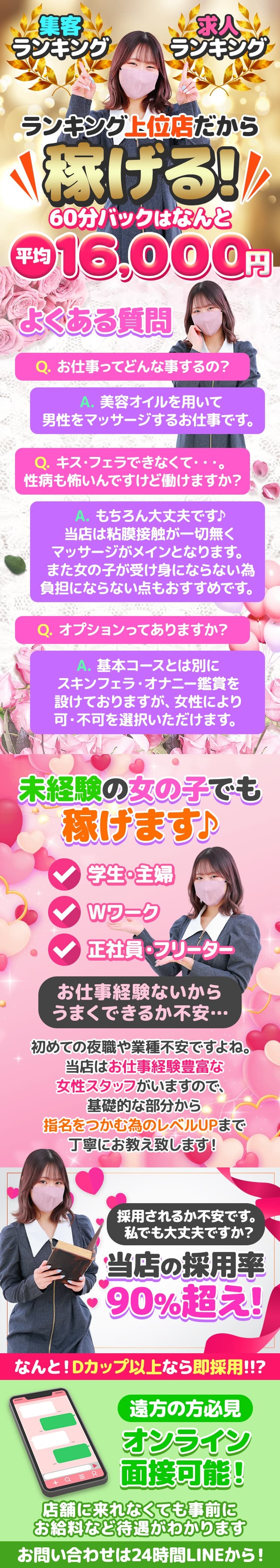 | A | 未経験の方が半数以上在籍してるのでご安心ください! 最初は女性スタッフが丁寧に教えてくれるのでご安心ください♪ 初々しさが逆にお客様に刺さる事も!!? |