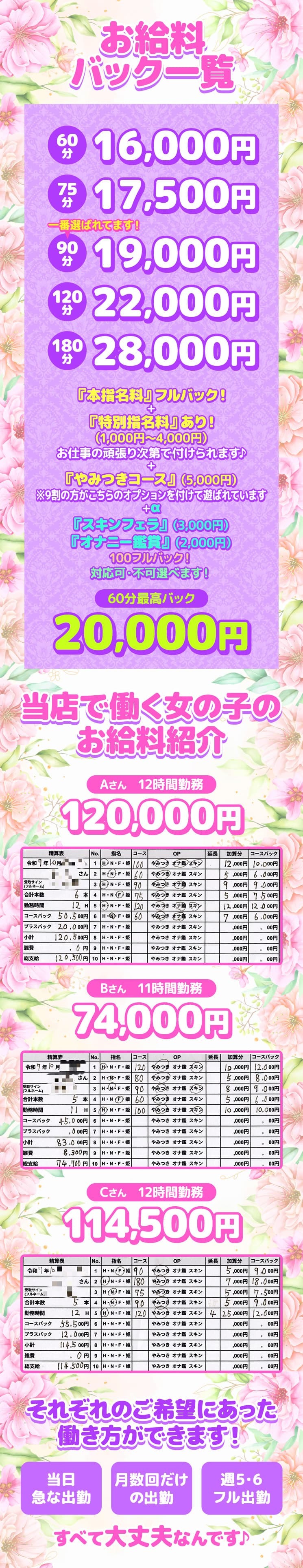 | A | 60分最低 11,000円から+α (コースバック+オプションフルバック) キス、フ〇ラ粘膜接触等ございません、ヘルスよりもソフトサービスでさらに高収入! 【給与例】 (アルバイト勤務) →日給30,000円以上 月30万以上 (レギュラー勤務) →日給70,000円以上 月100万以上 60分~180分等様々なコースがございます! 面接時に再度詳細はご説明させていただきます。 |