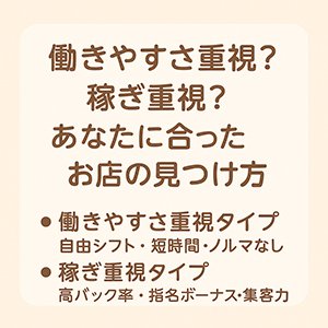 お店選びで迷うのは「とにかく稼ぎたい」「自分のペースを優先したい」どちらを取るかです。