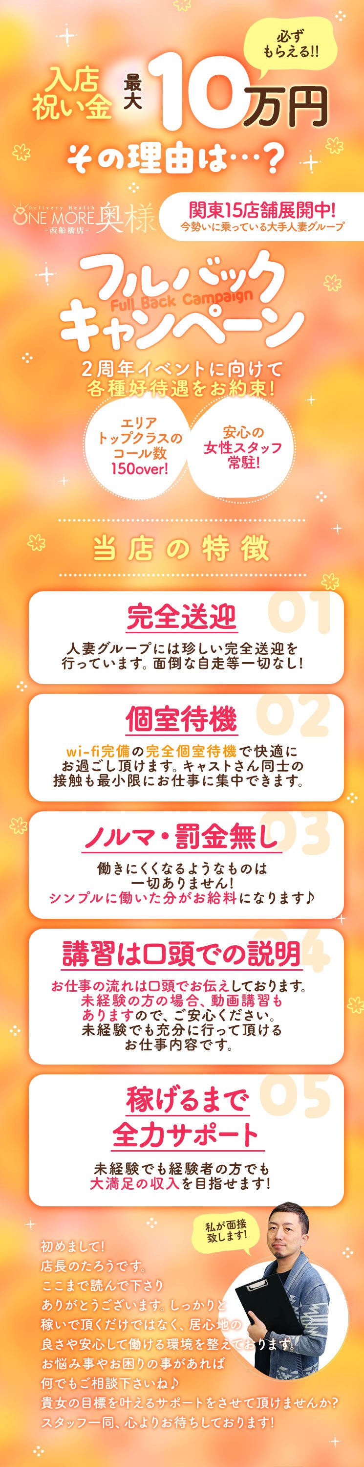 ーーー『One More 奥様 西船橋店』に応募した理由はなんですか?A.近場で探していて丁度合致したのもあり選んで応募してみました。今となっては選んで良かったなって思います。ーーーしっかりとお金を稼げていますか?A.稼げていますね。平均で3~5万は確実に稼げますね。迷ってる方がいたらコチラのお店をオススメします!