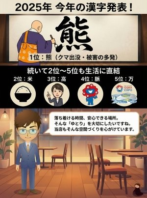 2025年の漢字は「熊」。今年は全国各地でクマの出没や被害のニュースをよく見かけましたし、「そんな所にまで?」と驚いた方も多かったのではないでしょうか。身近な話題として印象に残った一年だったように思います。