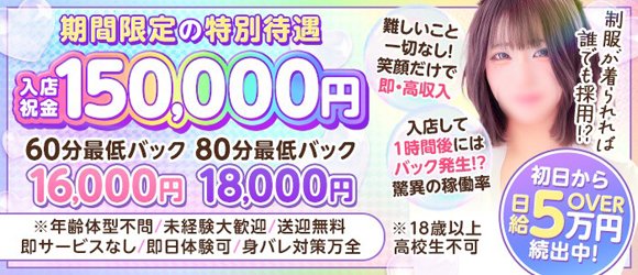 「今だけの期間限定キャンペーン実施中✨」入店するだけで10万円をキャンペーンでお得にゲットしましょう🌟キャンペーン期間中は特典がいっぱい🎁💰永久保証制度の実施💴 体験入店でもらえる単価ボーナスUP🎀 面接交通費プレゼント...