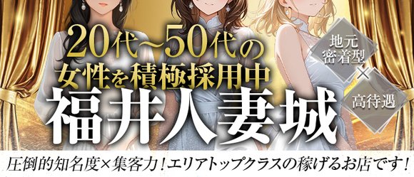 【平均出勤時間】A.6時間【1日のお給料】A.5万円以上【お客様について】A.未経験から入店させてもらったのですが、最初は不安と緊張がすごかったの覚えてます。。でも最初のお客さんもとっても慣れ照らして、一から教えてくれて、次の方もお土産を持ってきてくれたりしてくれて、優しい方が多いな~って思います!【スタッフについて】A.いつもいつも優しくサポートしてくれて、急な休みも快く受けてくれて、すいません。。助かっております✨【福井人妻城のここがオススメ】20年くらいあるらしく、お客様の情報や、サポート体制がしっかりしてます!お給料面も今では大満足です◎