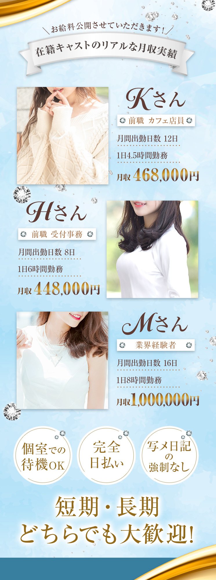 即日面接・即日体験入店も可能となり、すぐに稼いでいただけますので、貴女のご都合の中で時間を有効活用していただければと思います!