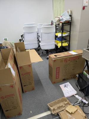 机は動いてるし、書類は山積み、段ボールが通路を占拠。