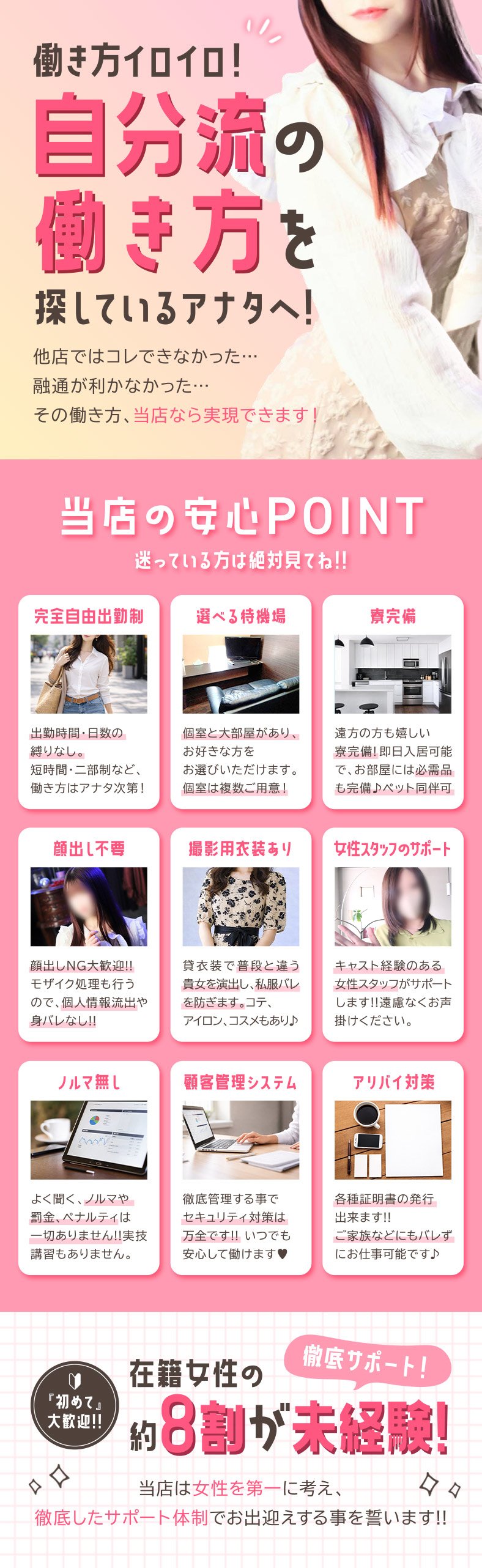 当店は朝8時~翌2時まで営業。 その中で好きな時間に働いていただけるよう 「完全自由出勤制度」を採用していますので 家庭をお持ちの主婦、シングルマザー 本職とのWワーク etc. いろんなご事情に対して柔軟に対応しております。 お気軽にご相談ください♪ ★未経験者歓迎! ★顧客管理システムによるセキュリティ対策万全 ★顔出しなし、モザイク処理による個人情報の保護 ★衣装提供で、普段と違う貴女を演出致します ★アリバイ対策も万全 ★出張面接OK、面接交通費支給 ★ノルマ罰金、実技講習一切なし ★駐車場完備(当店契約の駐車場) ★遠方の方、即日入居可能な寮完備 (ペット同伴可能!事前にご相談ください) ★アパート費用完全サポート (一人暮らしご希望の方) ★土曜日曜の休日のみの週末プランあります ★当然の本指名料、オプション料全額バック |