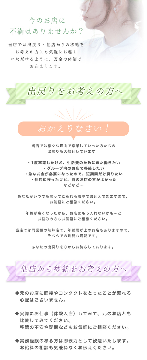 経営理念にも”キャストファースト(女の子第一主義)”を掲げて日々実践しています。出勤ごとの給料明細発行や清潔で快適な待機所の完備、どんな些細なことでも相談できる個別ミーティングの実施など、女の子が安心して働ける環境、満足してもらえる報酬に絶対の自信があります!当店は、あなたの「頑張り」「やる気」を絶対無駄にはしません!風俗業界の経験アリ ナシ問わず、ご応募をお待ちしております!