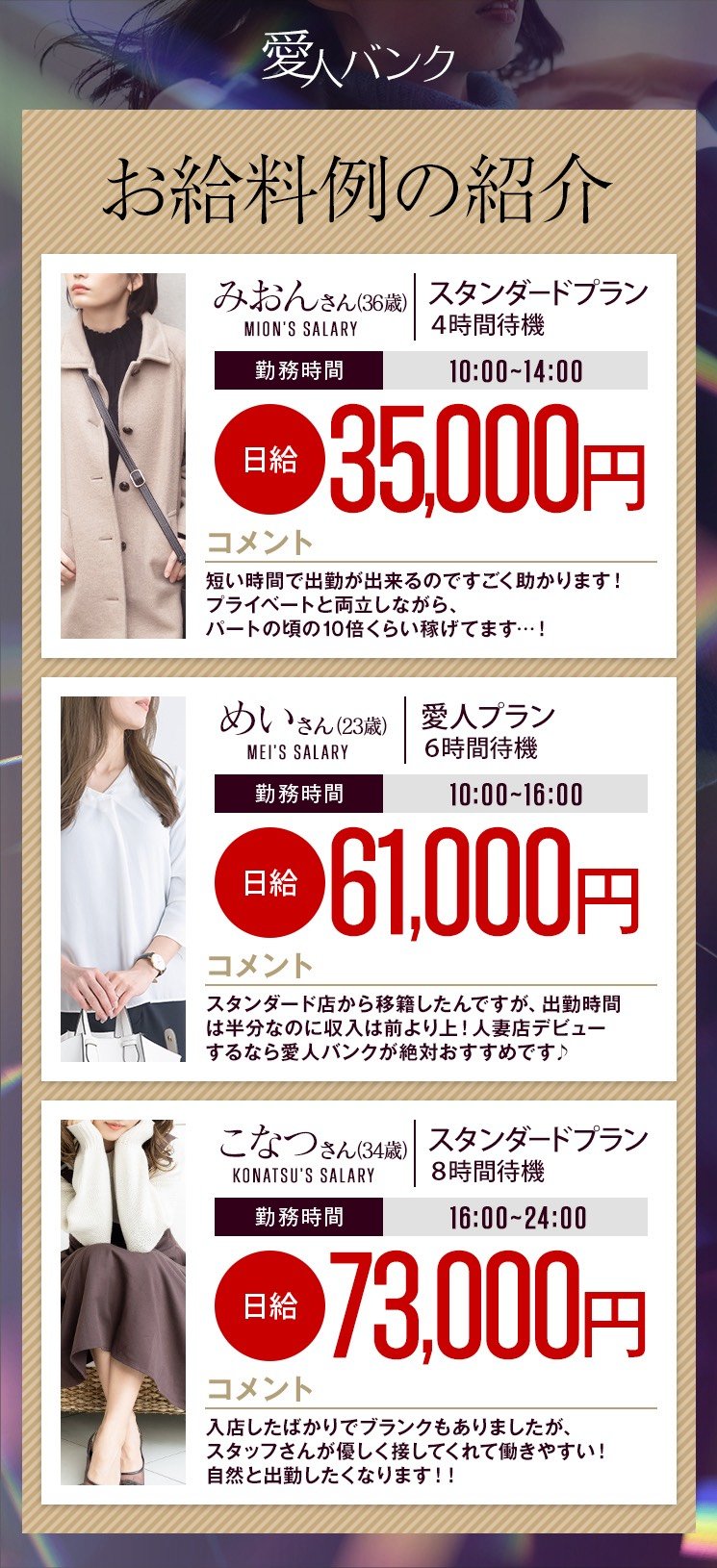 • 💎 エリア随一の高バック率(愛人79%・スタンダード75%・マダム73%)