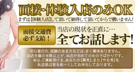 また、当店の面接は、他店様よりも、時間が少し長目になるかと思います。なぜなら、当店の現状を、嘘偽りなく、すべてお話させて頂く為で、勿論、面接に来られた方からのご質問は全て正直にお答え致します。遠慮なく何でもお聞き下さいませ。