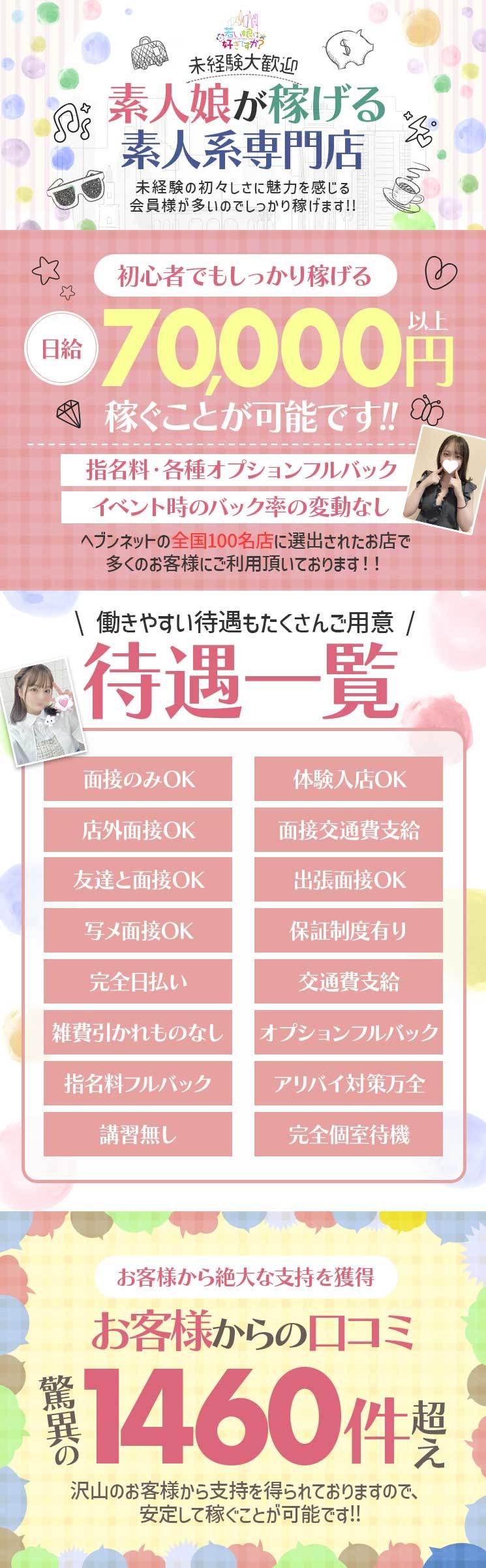 | A | 当店は素人店になりますので 未経験でご入店される女の子の割合が非常に高いのですが、皆さんしっかり稼いで貰ってますのでご安心下さい! 講習はありませんが、お仕事内容は口頭でしっかりご説明させて頂きます。 HPにも記載して、お客様にもご案内前に必ず未経験である事をお伝え致しますので 胸を張って未経験者としてお仕事出来ます。 |