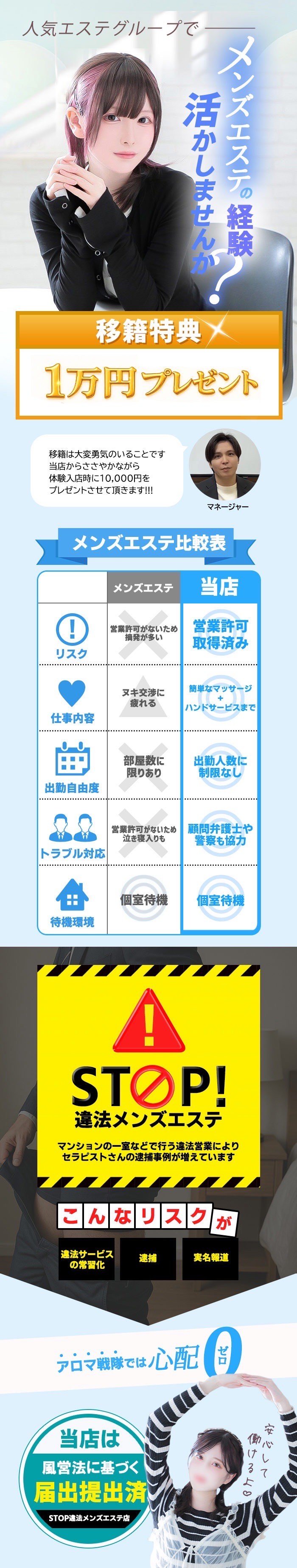 | A | 当店は掛け持ちの方も大歓迎です。 短時間でもしっかりと女の子が稼げるようサポート致しますので、お気軽にご相談ください。 |