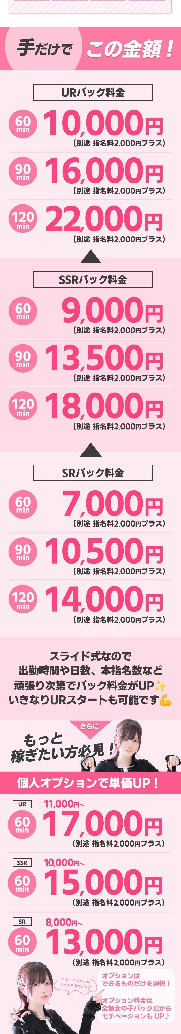 | A | 上記のサービス内容にプラスして、女の子個人の選択で追加できるサービスです。オプション料金は「全額女の子バック」なのでエステでもっと稼げたい方にオススメです。 個人オプション料金 ------------------------------- 【1000円】 ■コスプレ ■キス 【2000円】 ■スキンリップ 【2000円~3000円】 ■オールヌード |