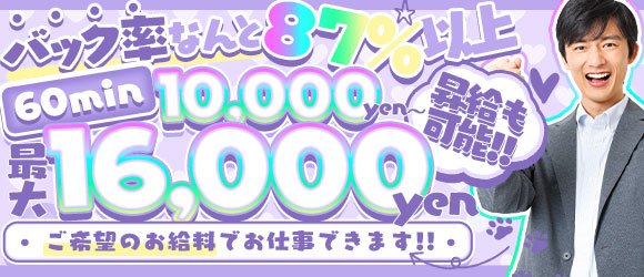 バック率87%以上保証★ お給料60分10,000円~最大16,000円可能‼女の子が働きやすい環境を徹底的にご提供!!