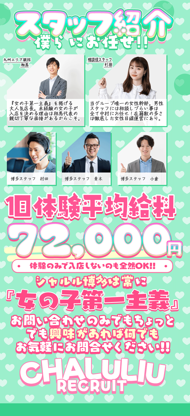1日体験 平均日給 70,000円以上!! 全額当日払い! 即日面接・同日体験可能! 未経験者大歓迎☆彡 【未経験者大優遇】 当店は8割の女の子が未経験者で入店しています 女性エリアマネージャーもいますのので 不安なことはなんでも相談ください 【給料】 60分10,000円~最大16,000円可能 ★バック率87%以上保証★ 給料に関しては希望の給料で働いていただけます! 面接時や入店後の給料UPでも希望の給料をお伝えください! ★☆★☆博多店ってこんなトコロ☆★☆★ ⇓⇓⇓⇓⇓⇓⇓⇓⇓⇓⇓⇓⇓⇓⇓⇓⇓⇓⇓⇓⇓⇓⇓⇓⇓⇓⇓⇓⇓⇓⇓⇓⇓⇓⇓⇓⇓⇓⇓⇓⇓⇓⇓⇓⇓⇓⇓⇓⇓⇓⇓ 当店は『出稼ぎキャストを一切雇ってません!地元の女の子がちゃんと稼げるお店』 出稼ぎキャストは保障があるからフリーやおすすめされて入る仕事が全部でに充てられるといった心配一切不要! 当店は、奇策なスタッフが多く 女性スタッフもいるので未経験の女の子でも安心して楽しく働けます★ 【各店のキャストも同時募集!!】 よく、こんな声を面接時に伺います。 『6時間も待機していたけど、1日仕事がつかなかった、、、。』 当店では、そんな事は起こりません!! もちろん、このエリアはNGなどのご要望にもお応えしますので、入店時にご相談ください(^o^)/ 《当店と女の子のお約束》 【どこのお店よりも稼ぐノウハウをお教えします】 【完全女の子主義のスタッフ一同の全力サポート】 どんな相談も受け付けます! 是非まずはお問い合わせを! アクセス急上昇で緊急事態! 女の子が足りていません! ぜひとも、気軽に面接に来て下さい! 【法人経営で官公庁対応の各種証明書発行可能】 家も借りれます!ローンも組めます! 【女のコ第一主義で働きやすい】 何かあればすぐに対応しております! やる気重視!元気重視! 容姿に自信がない...未経験で不安... 頑張るアナタを当店は全力でサポート致します! |