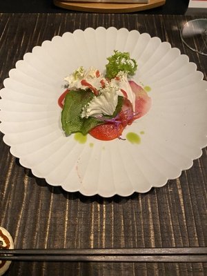福岡市中央区赤坂にある ガストロノミヤ古賀けいすけ に行ってきました。 コースの中でいただいたのが、 刺身のぶり大根。 めちゃくちゃ珍しい、 人生初のぶり大根でした! 僕はどちらかというと 煮付けの方のぶり大根がすきでしたが、 しっとり脂ののったぶりのお刺身に、 やさしく味が染みた大根が相性抜群でした。ww 見た目もとても綺麗で 、まさにガストロノミーらしい一皿。 さっぱりしているのに旨みがしっかりあって、 最初からテンションが上がる料理でした。 赤坂でゆっくり美味しい 料理を楽しみたいときにおすすめのお店です。