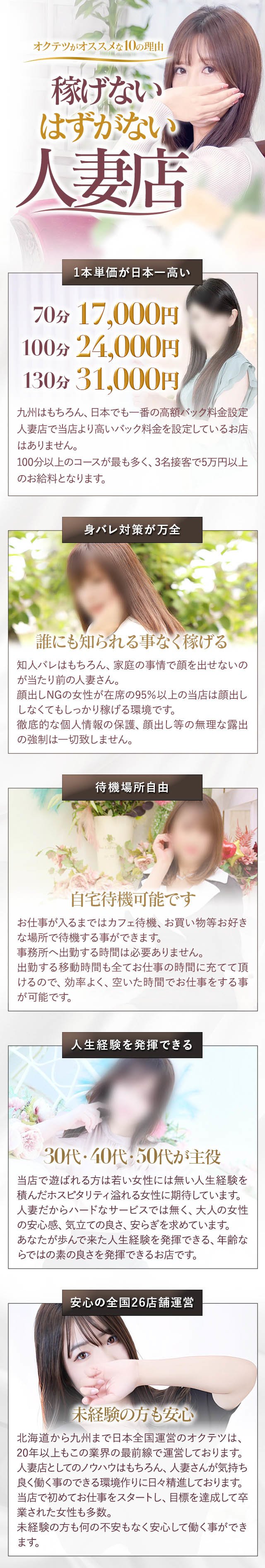 | A | 人妻店の中でも特に女性のプライベートは尊重させて頂いております 家庭の事、お子様の体調不良の急な帰宅など家庭を優先してお休みして頂いております |