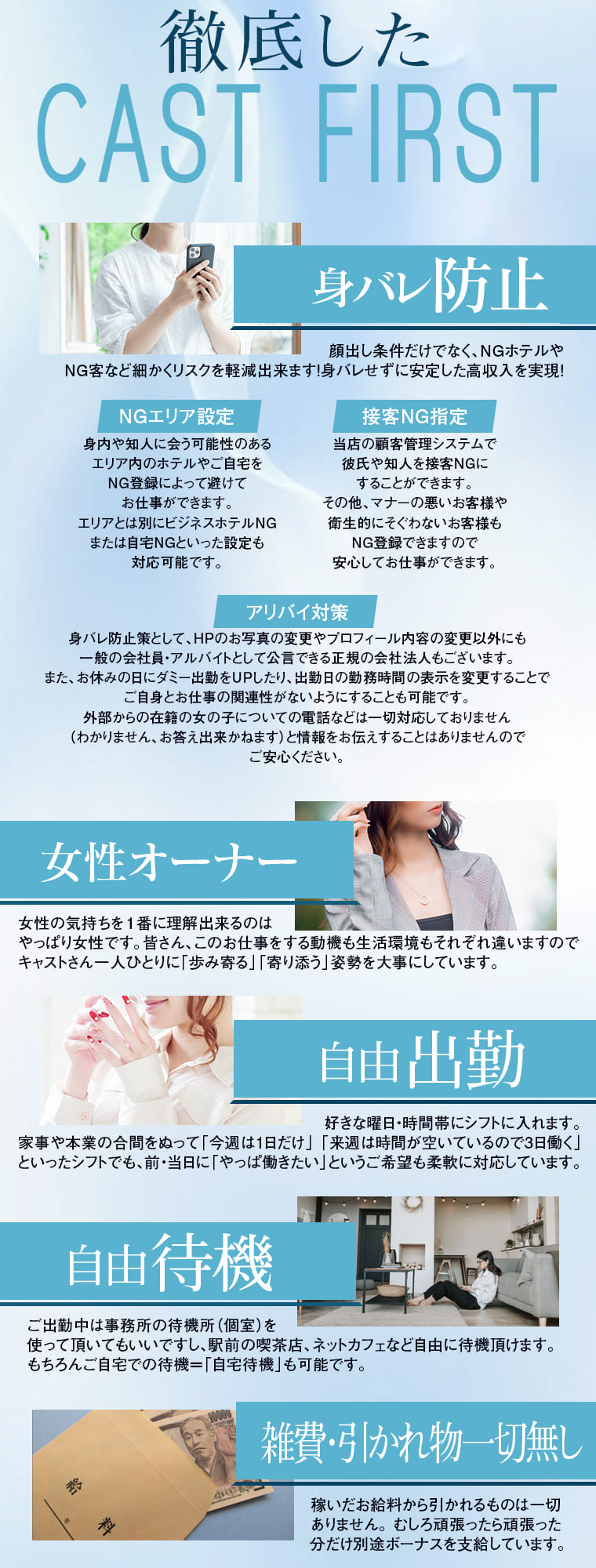 「女性ファースト」、「稼げる」、「信頼される」をモットーに日々頑張っておりますのでよろしくお願いします。